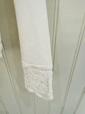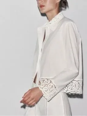 An effortlessly elegant piece with a romantic, vintage-inspired feel, featuring delicate lace at the collar, cuffs, and hem.