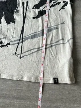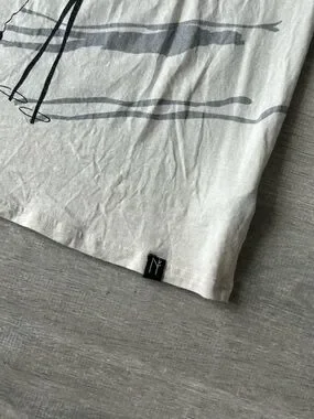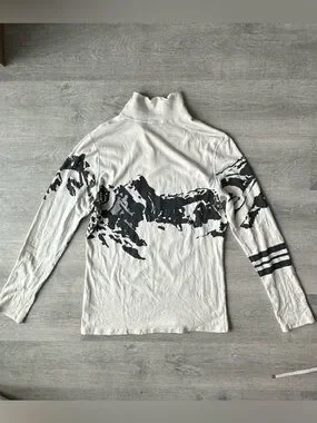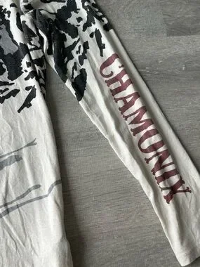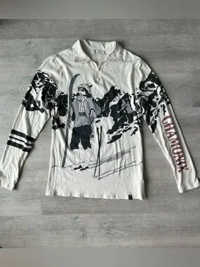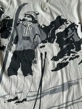 Graphic quarter-zip pullover/ base layer with retro skier print. Ivory base with black and gray mountain and skier artwork. Long sleeves with stripe detail and 'CHAMONIX' text on one sleeve. Soft, casual layering piece. Clean, wearable design.