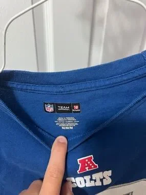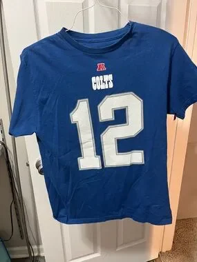 Royal blue NFL Colts tee with large white #12 on front. Small red AFC logo above team name. Soft-looking jersey-style print. Great for team supporters.