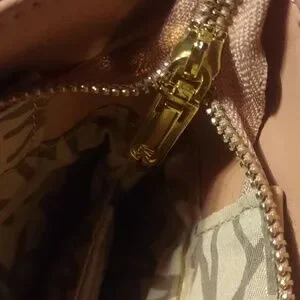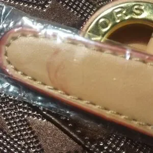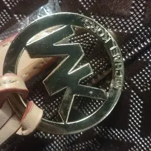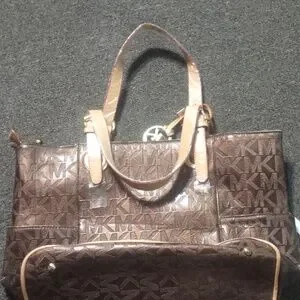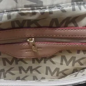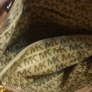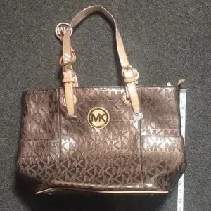 brown metallic hand tote bag by MK. never used, has been sitting in storage. this was given to a relative who gave it to me. since it had been sitting away for a while there is a crease on the bag of the bag from where it was folded and tarnish on the MK metal charm.