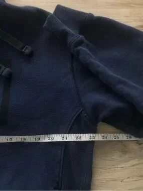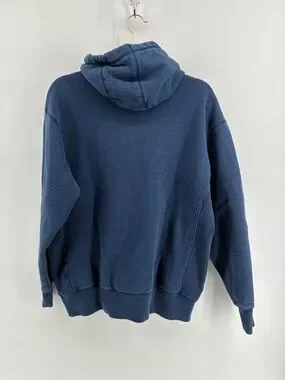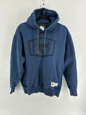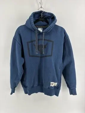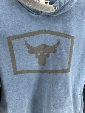 Cozy navy blue pullover hoodie from Under Armour. Front bull emblem for a sporty look. Drawstring hood and ribbed cuffs. Soft feel suitable for casual wear.