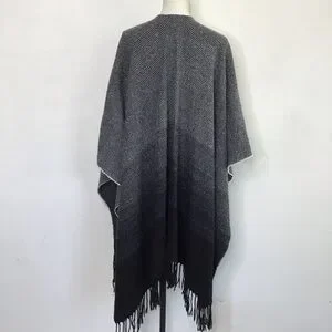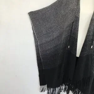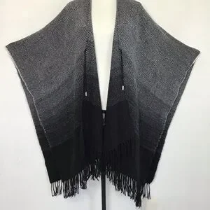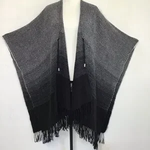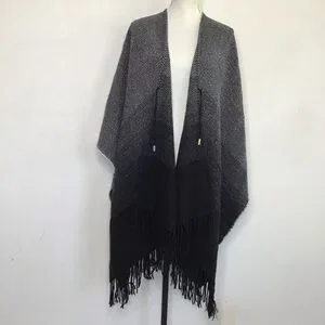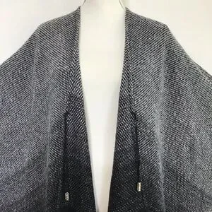 Step Out This Fall In This Chic Marc New York Black Grey Butterfly Wings Shawl Cape ( One Size). Features a classic monochrome houndstooth design, Shoe String Front Tie and Fringe. Wrap over an outfit for any occasion. This shawl is in excellent condition. No Rips, Stains or smells. See pics for measurements.