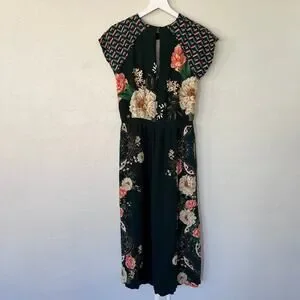 Dark green midi dress with a mixed-print design featuring oversized florals, geometric paneling at the shoulders, and a softly gathered waist with tassel ties for a relaxed, bohemian silhouette.