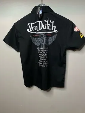 Von Dutch on front left, 2 von Dutch patches on right arm, tour city graphic on back.