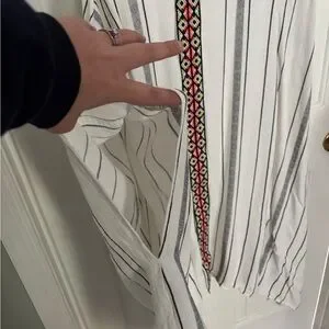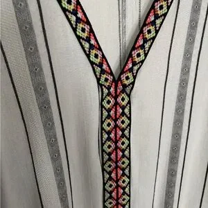 Elegant white swim coverup featuring black stripes. Ideal for a chic look.