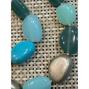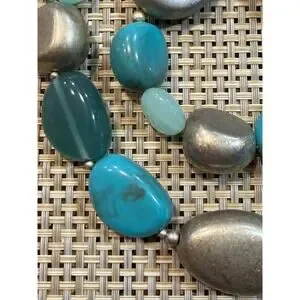 Beautiful Jones New York necklace and matching earrings set featuring vibrant turquoise-blue faceted beads with neutral and gold-tone accents. This statement piece offers a bold yet elegant look, perfect for dressing up any outfit.