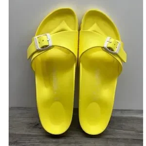 Birkenstock Madrid EVA sandals in a vibrant neon yellow offer a lightweight, waterproof alternative to the classic cork footbed. These single-strap slides feature an anatomically shaped footbed designed for comfort and support, paired with a matching adjustable buckle for a secure fit. The durable EVA construction makes them ideal for the beach, pool, or gym, providing a flexible and shock-absorbent experience. Their bold colorway adds a pop of brightness to any casual summer outfit.