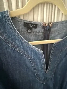 Talbots women's denim dress in a medium blue wash. Short cuffed sleeves and a V-notch neckline. Self-tie belt defines the waist. Lightweight, casual style for everyday wear.