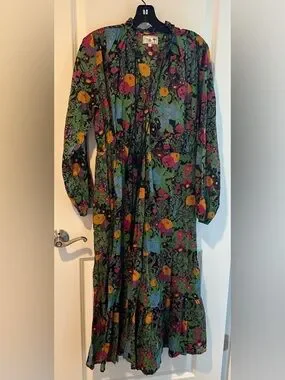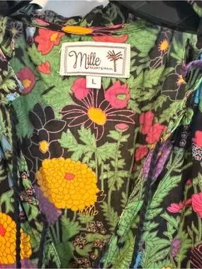 Mille Astrid Midi Dress Botanica Floral Tiered, size large. Lightweight floral tiered midi dress in black with vibrant multicolor blooms. Features a relaxed fit, long sleeves, and a flowy skirt for effortless movement. Designed for easy styling and everyday wear. In great condition!