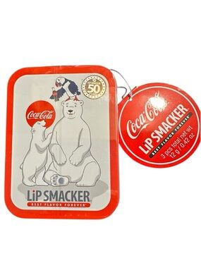Lip Smacker Coca-Cola 3-Piece Lip Balm Set housed in a collector's tin. The tin features the iconic Coca-Cola polar bears and a puffin, celebrating the brand's 50th anniversary.