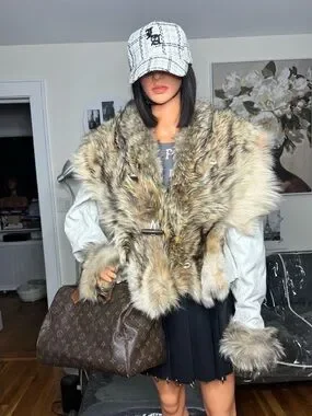 Statement genuine fox fur soft leather jacket with 3 hook closure and voluminous multi-tonal fox fur trim and faux fur lining. White soft leather sleeve detailing and fur-trimmed cuffs. Eye-catching neutral palette. Perfect for layering and making a bold look. Purchased years ago. The jacket has no size label. I wear size Medium and this jacket fits well with room to spare. Has some staining on leather (see pictures) and small imperfections to small areas of fur due to age. Still a gorgeous statement piece with a lot of wear left in her.