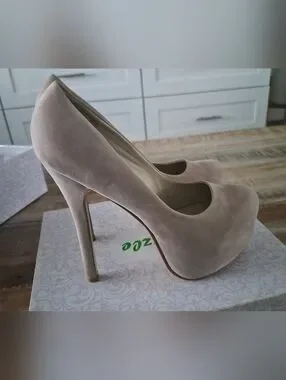 These elegant nude platform pumps are meticulously designed to create a sleek silhouette. The soft, suede-like finish provides a refined aesthetic. Featuring a high stiletto heel, they effectively elongate the leg, making them ideal for formal or evening attire. The cushioned insole ensures enhanced comfort, suitable for extended wear. This item is free from any blemishes, marks, or damage.
