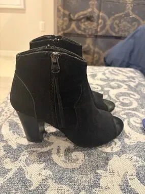 XOXO Black Suede Peep-Toe Ankle Booties with Side Tassel Zip