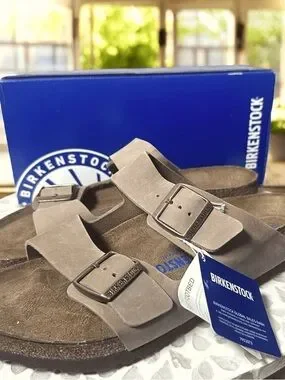 Classic two-strap Birkenstock sandals with adjustable buckles. Soft suede upper and contoured footbed for support. Neutral taupe-brown tone complements many outfits. Durable cork-latex sole for everyday wear.