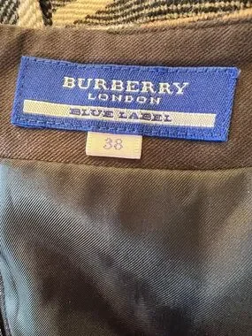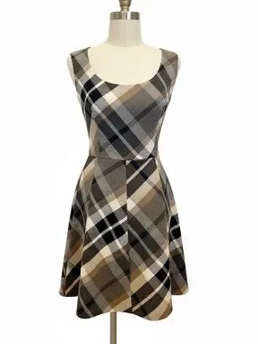 Tailored sleeveless midi with classic Burberry plaid. Fitted waist and flared skirt for movement. Timeless neutral palette for versatile styling. Pairs well with boots or pumps.