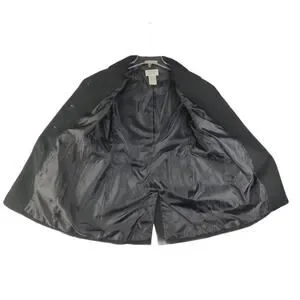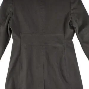 This classic John Paul Richard Uniform coat has a 97% cotton, 3% spandex textured black outer shell with a 100% polyester satin black lining. The coat features a 4-button closure, wrist length sleeves, cinched back panel, 8.5" back vent, shoulder pads, collared neckline, two side pockets and mid length.