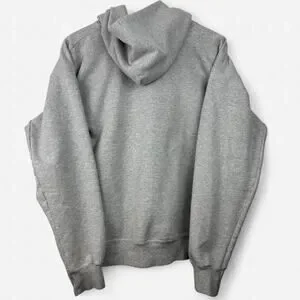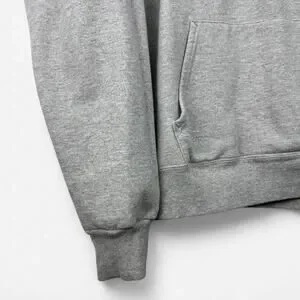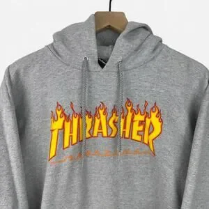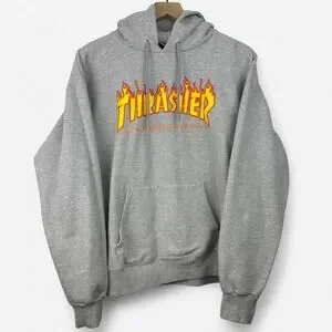 Classic grey Thrasher hoodie featuring the iconic flame logo across the chest in bold yellow and orange. Cozy midweight feel with a relaxed fit and front kangaroo pocket. Small faint stain on sleeve as pictured, otherwise in excellent condition.