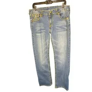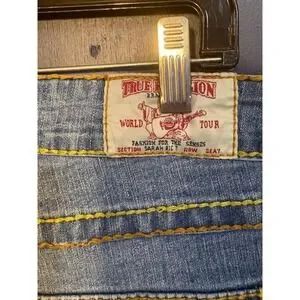 True Religion Sarah Big T Straight Leg Jeans Blue Yellow Stitch Size 31 USA