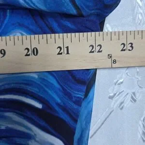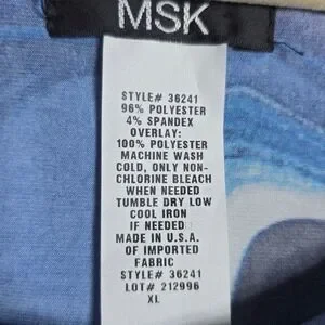 MSK tunic dress in size XL featuring a striking blue swirl print. The design includes an asymmetrical overlay for a unique silhouette. This dress is crafted with a blend of polyester and spandex, with a 100% polyester overlay, ensuring both comfort and a graceful drape. Its vibrant pattern and thoughtful construction make it a standout piece.