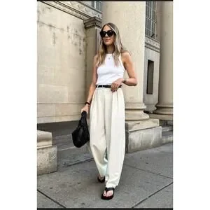 Keywords: Old Money, Quiet Luxury, Minimalist, Scandi, Clean Girl, Neutral, Trousers, High Waisted, Pleated, Wide Leg, Barrel Leg, Ecru, Cream, Tailored, Streetwear, Preppy, Academia, City Fashion
