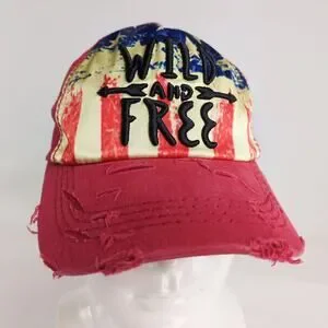 Features: Front satin American Flag panel, "Wild And Free" embroidered on front & back, 100% cotton, red, 5 panel, adjustable hook/loop fastener strap, curved visor, distressed finish, made by 4350 District