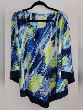 Alfred Dunner Blue, Lime & White Abstract Brushstroke Tunic w/ Necklace