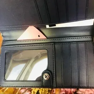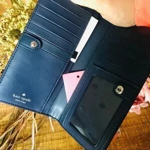 Charming and functional, this Kate Spade New York snap wallet features a playful hot air balloon print over classic blue stripes with a KSNY metal pinmount logo on the front. Compact yet well-organized, it’s perfect for everyday use or gifting.
