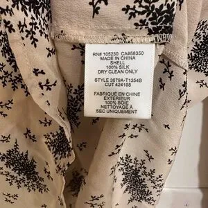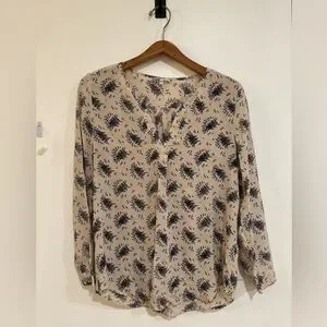 Women’s JOIE blouse + 100% silk + size small + v-neck design + beige in color with black floral design + no flaws / good, used condition with light wear + approx measurements, pit to pit: 20in & length: 26in + ships from 100% smoke free home + retailed for $258