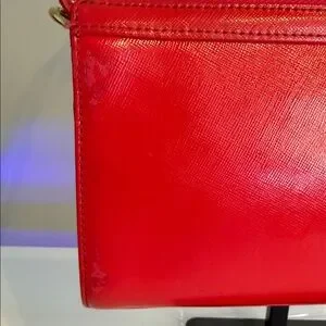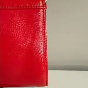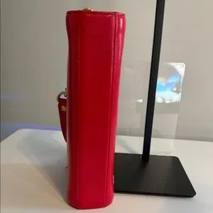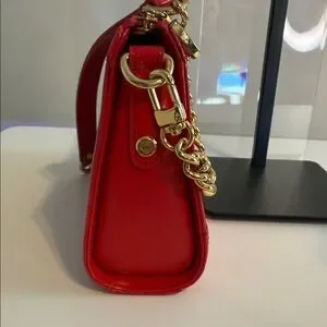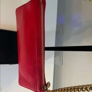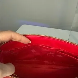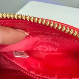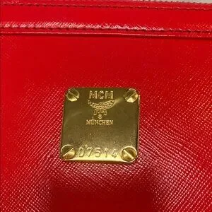 Sleek red leather shoulder bag by MCM. Gold-tone chain and hardware. Zip top closure. Front logo plaque detail. Structured silhouette for polished looks.