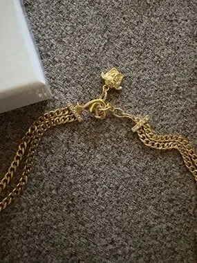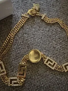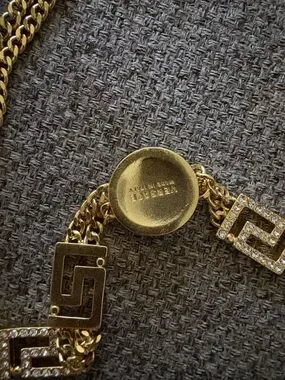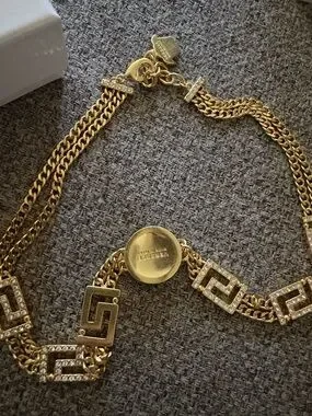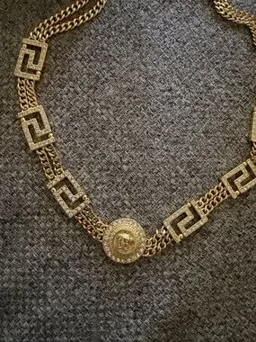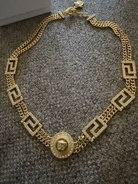 Versace gold-tone necklace with central Medusa medallion. Sparkling crystal pavé accents on medallion and Greek key links. Dual chain strands for bold look. Lobster clasp closure for secure wear. Ideal for statement and evening styling.