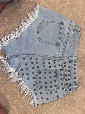 Stylish light blue denim shorts with stud embellishments and a frayed hem. Designed for a trendy, casual look and easy summer styling. Features distressed details and front pockets for functionality.
