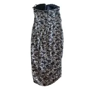 La Scala USA strapless cocktail dress showcases an intricate black and silver metallic lace overlay adorned with shimmering sequins. A dazzling rhinestone-embellished waistband adds a touch of glamour, while the sweetheart neckline and tulip-style high-low hem create a sophisticated silhouette. This elegant evening piece features a secure back zipper closure and a fully lined interior for comfort and structure.