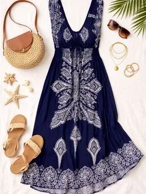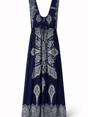 TAG FELL OFF* This Jessica Taylor maxi dress features a beautiful navy and white paisley print with a flowy silhouette that moves beautifully and feels comfortable all day.