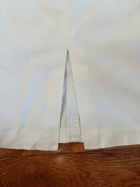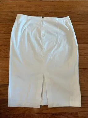 Crisp white pencil skirt with a streamlined silhouette. Smooth fabric with minimal detailing. Classic shape ideal for work or events. Pairs well with blouses and tailored jackets. Size 2