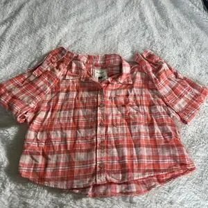 This is a super cute, lightweight American Eagle Outfitters plaid button-down distressed shirt. It features a vibrant orange and white plaid pattern with a modern cropped fit. The back has a subtle babydoll-style pleat that gives it a slightly flared, feminine silhouette.