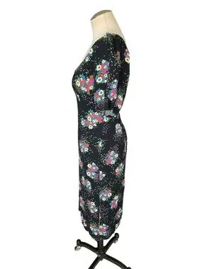 This piece hugs through the bodice and flows through the skirt for an effortlessly flattering shape. The vibrant multicolor floral print pops against the black background, making it perfect for both day and night wear.