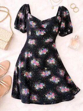 Beautiful floral dress by Anthropologie featuring a flattering fit-and-flare silhouette with a feminine sweetheart neckline and puff sleeves 🌸