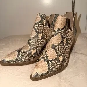 Pointed-toe ankle booties in a snake-print leather. Slip-on style with low stacked heel. Neutral beige and black pattern complements many looks.