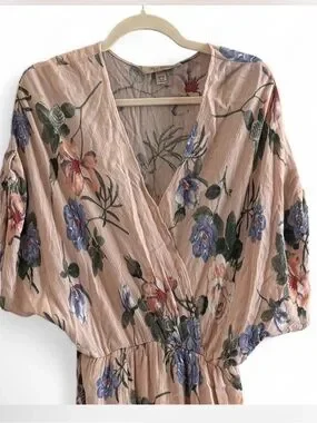 Soft blush pink maxi dress with subtle blue floral accents. Lightweight textured fabric with dolman short sleeves. Casual feminine style.