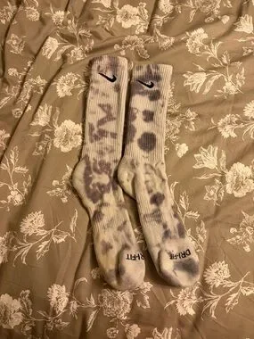 Classic Nike crew socks with gray tie-dye on a white base. Soft knit for daily comfort. Elastic cuff for secure fit. Black Nike Swoosh detail for athletic style. worn once