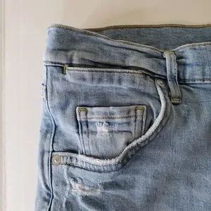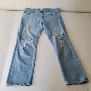 Light wash boyfriend jeans with subtle distressing. Mid-rise fit with relaxed leg. Classic five-pocket styling. Faded, vintage-inspired look. Versatile and casual.