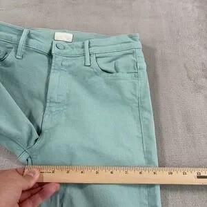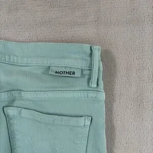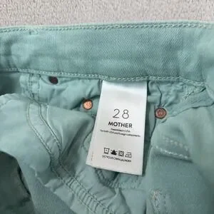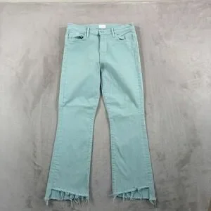 The Mother The Insider Crop Step Fray Jeans in Lagoon are a stylish and comfortable option for women size 28. Made in the USA with a blend of polyester, spandex, and cotton, these mid-rise jeans feature a raw cut hem and a 5-pocket design. The ankle-length style is perfect for the warmer seasons of summer, fall, and spring, with a solid green color and light fabric wash. Easy to care for with machine washable instructions, these jeans offer both comfort and breathability, making them a versatile choice for everyday wear.
