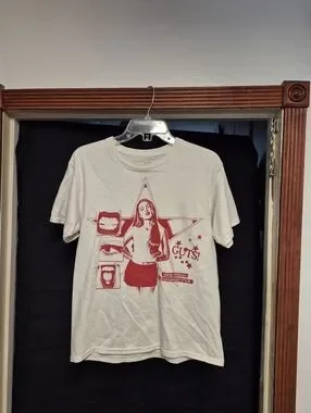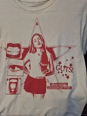 White cotton tee with red all-over graphic featuring Olivia Rodrigo and "GUTS!" text. Bold red print delivers a vintage pop look. Casual and statement-making.