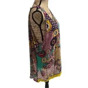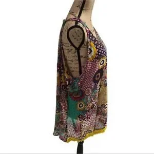 Vibrant sleeveless tunic top from Umgee USA + features a bold mixed floral and geometric patchwork print in teal, magenta, and mustard. Designed with a flattering V-neckline and a high-low hemline accented by delicate yellow crochet fringe trim, this lightweight cotton-blend piece offers a relaxed, airy silhouette. The back showcases a square neckline and a sheer-effect paneling that adds a touch of breezy elegance to the bohemian aesthetic.
