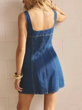 The blue casual button‑front denim mini dress combines a body‑con silhouette with a square‑neckline for a relaxed vacation vibe. A regular fit and natural mid‑waist create comfortable shaping, while the straight‑cut hem adds a classic finish. Crafted from soft denim, the dress features a button front for easy styling and a sleek square neck that highlights the neckline.