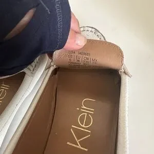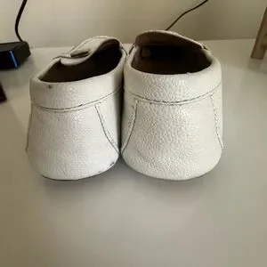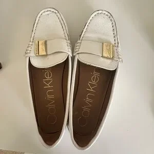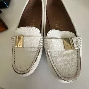 Elegant white loafers with a stylish gold detail. Perfect for versatile wear.