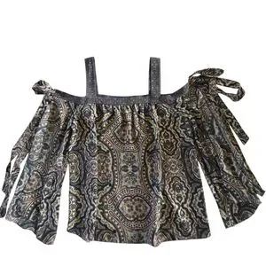 Chic off-shoulder design with intricate patterns. Stylish and versatile for any wardrobe.