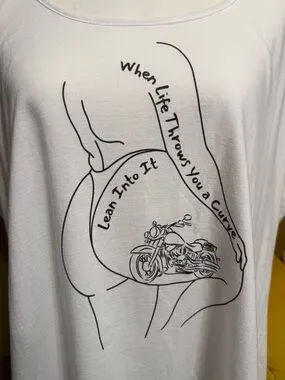 Get ready to ride with this original custom design. This white tank features my original design in a bold, minimalist line art graphic and the phrase "When Life Throws You a Curve Lean Into It" perfectly placed. It is a total mood for any plus size baddie who loves the open road or just an edgy, custom look.