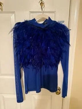 Sheer royal blue mesh long-sleeve top. Feather-trim detail across the chest and shoulders. Lightweight and statement-making. Tag attached.