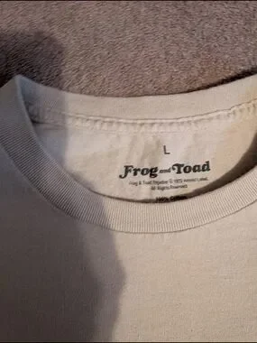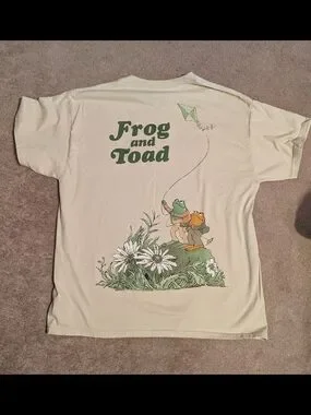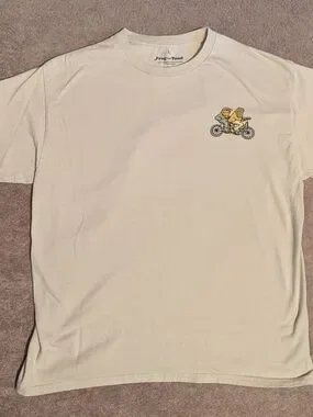 Frog and Toad cream short-sleeve crewneck with a small bicycle graphic. Lightweight cotton blend for comfortable everyday wear. Clean, understated design that pairs well with casual outfits. Features the Frog and Toad brand and cream color for a relaxed look.